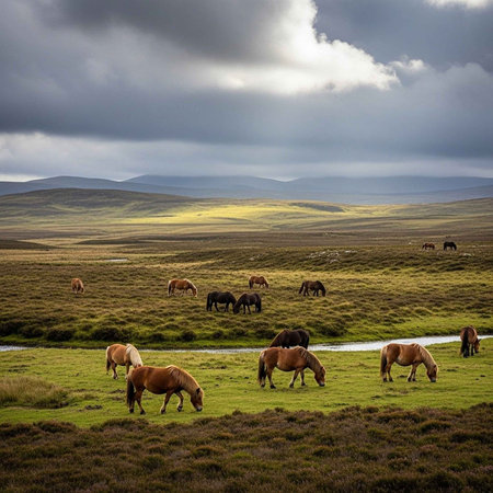 A highland cow grazes on a hillside, surrounded by beautiful, serene natural landscapes.