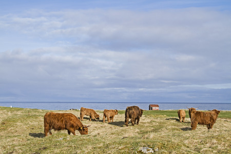 Highland Cattle with sea and islands in background, Isle of Skye, Scotland