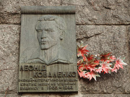 Kiev, Ukraine January 2, 2021: Plaque of honor on the house where Leonid Kovalenko lived, a famous Ukrainian literary scholar and critic
