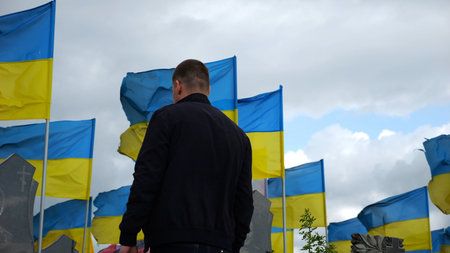 Mourning man standing among countless graves of ukrainian soldiers with national banners pay tribute to fallen family member in Kharkiv. Scene reflect personal sorrow loss caused by russian aggression
