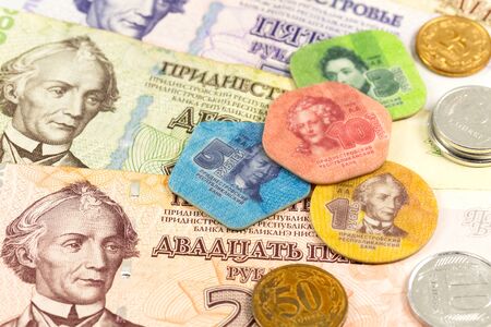 detail of some transnistrian ruble banknotes and coins indicating growing economics