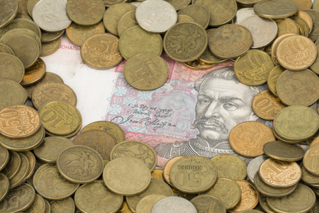 close up of ten and five Ukrainian hrivnya coins lying on five hundred hrivnya banknote