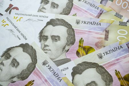 Money of Ukraine. Several Ukrainian hryvnia banknotes. UAH. Hryvnia 500