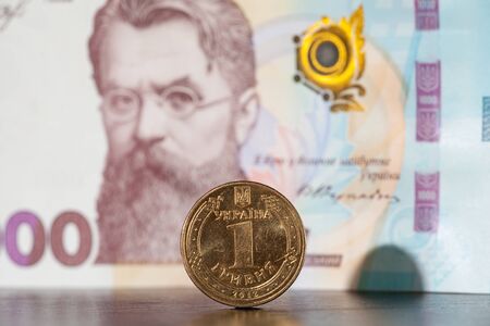 Hryvnia coin on the background of a banknote of 1000 hryvnias. Ukrainian money. Concept earnings. Shallow depth of field