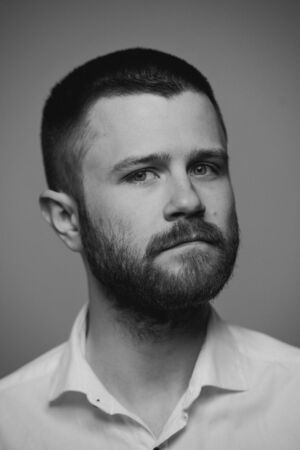 Portrait of a man with a beard on a gray background.