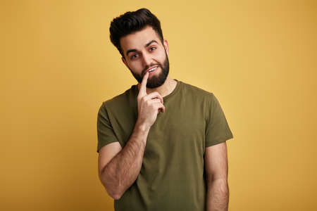 awesome pleasant man with a finger on his mouth looking at the camera. I am sorry. close up photo. teeth care