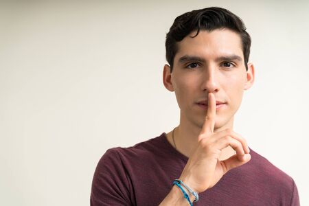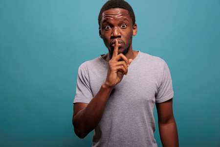 Male model doing hush sign with finger over lips to keep secret about confidential gossip in studio. Secretive person showing mute symbol to be silent and quiet about private conversation.