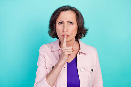 Photo portrait woman in casual clothes keeping finger near lips secret isolated vibrant teal color background