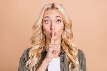 Photo woman blonde hair keeping secret finger near lips isolated pastel beige color background