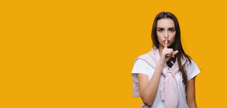 Charming brunette caucasian girl is gesturing silence on yellow background with freespace