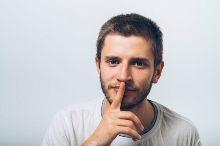 Closeup of Caucasian male with finger on lips against white background