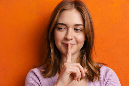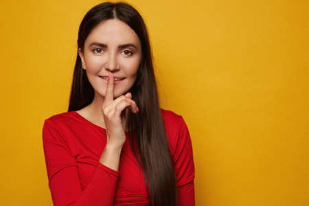 Portrait of pretty, charming, mysterious, sexy, attractive woman holding forefinger on mouth, asking to keep silence