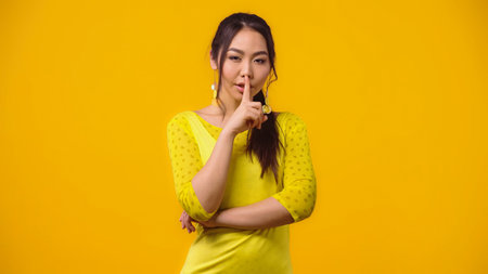 young asian woman showing hush sign and smiling isolated on yellow