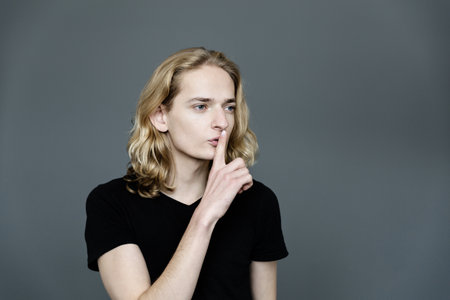 Young guy with long blond hair held his index finger at the lips, calling for silence. Gesture of silence