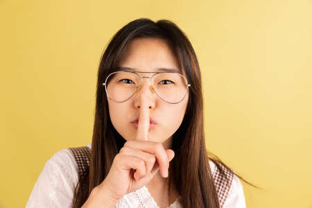 Asian female model keeping index finger near mouth making hush sign. Closeup portrait of young Korean woman demands silence, respecting woman s secret