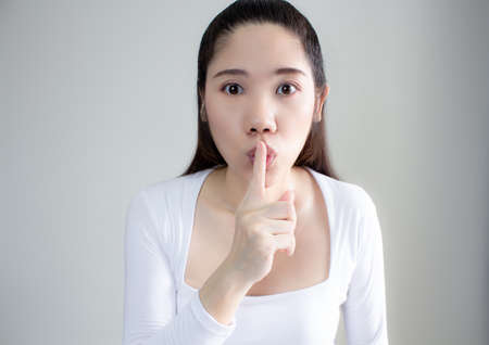 Asian woman finger on lips to asks to be quiet make hush tells secret. Secret concept