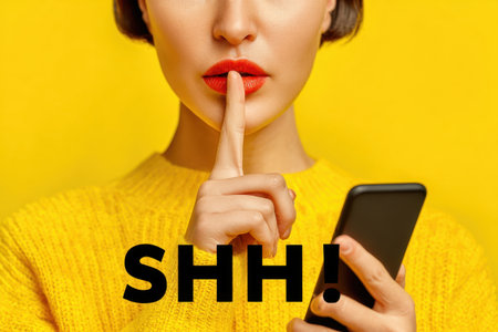 Woman with red lips showing silence gesture with finger on lips, holding smartphone and shh text on yellow background. Concept of privacy and confidential communication