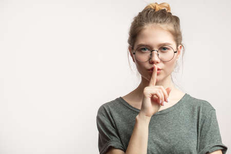 Young beauty girl. Shh concept. Silent gesture.