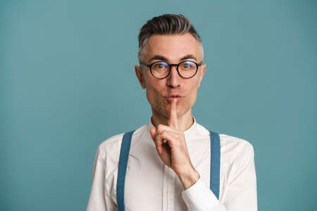 Mature man puting finger on his lips, making silence sign on blue background
