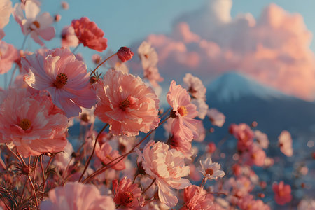Vibrant pink flowers in full bloom, set against a breathtaking mountain backdrop under a soft, cloud-filled sky. the warm lighting and natural composition evoke tranquility and the beauty of springtime. Generative AI