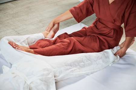 Therapist stretching woman’s leg. Shiatsu massage.