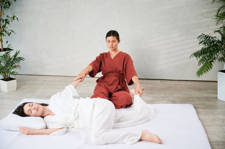 Masseuse making thai yoga massage. Woman therapist doing traditional massage treatment, stretching female patients body. Client lying on mat, enjoying hand massage in calm atmosphere.