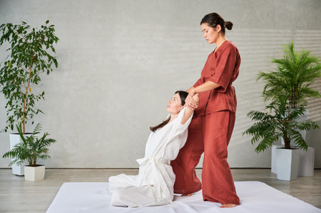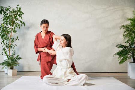 Masseuse making thai yoga massage. Woman therapist doing traditional massage treatment, stretching female patients body. Client sitting on mat, enjoying hand massage in calm atmosphere.