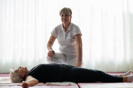 Professional female physiotherapist assisting an older woman lying on a mat during a therapeutic rehabilitation session. Wellness and physiotherapy concept highlighting recovery, mobility, pain relief, and holistic healthcare.