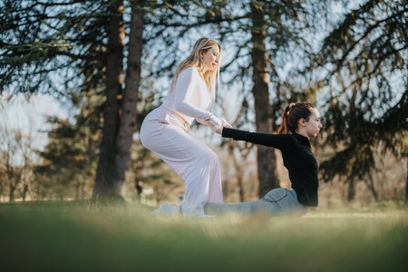 Two women practicing a partner workout in a park on a sunny day, surrounded by trees, focusing on health, fitness, and balance.