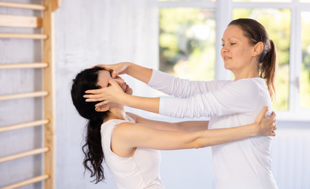 Crop woman conducting psychotherapy with body contact