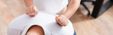 Cropped view of masseuse doing massage of client back on blurred background, banner