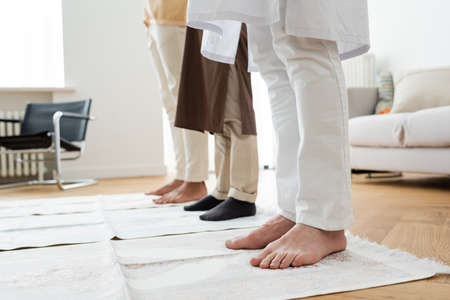 Cropped view of barefoot muslim man standing on rug at home