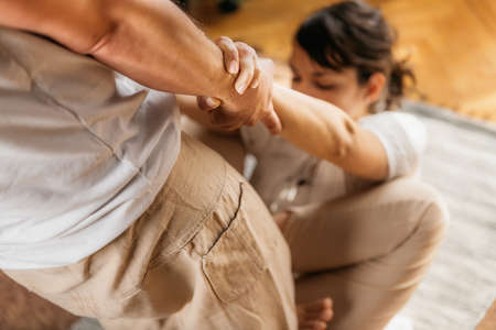 Reiki Class. Reiki instructor therapist holding hands over the elbow of a patient
