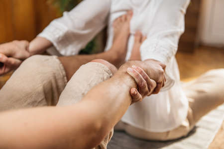 Thai massage session with a therapist in a massage room. Traditional Asian stretching therapy.