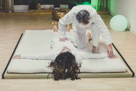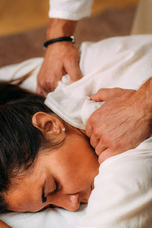 Therapist man doing a Shiatsu massage to a woman. Holistic therapy, treatment with manipulation by thumb, fingers and palms. Wellness, health, relaxation, well-being and alternative medicine concept.