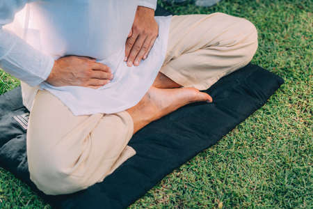 Male therapist performing reiki therapy self-treatment holding hands over his stomach. Alternative therapy concept.