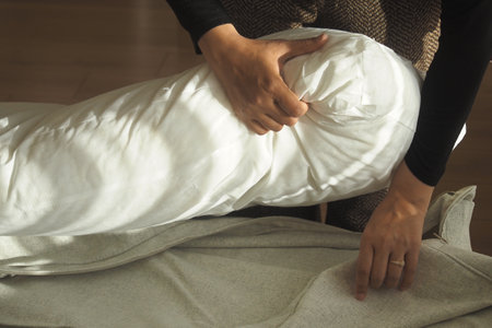 Organizing bedding with a stylish pillow in a cozy bedroom setting