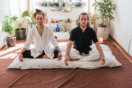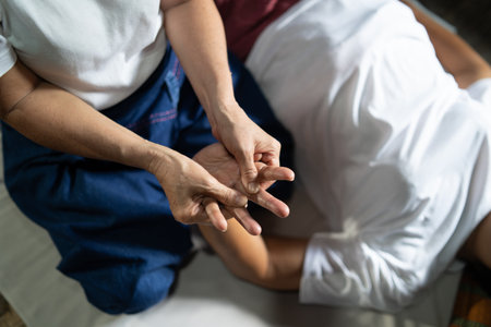 Masseuse making thai yoga massage. Woman therapist doing traditional massage treatment for male patient indoors. Bald client sitting on mat, meditating, enjoying hand massage in calm atmosphere.
