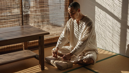 Zen-like interior with slatted window blinds casting strong horizontal shadows on a person wrapping a modest, rustic present.