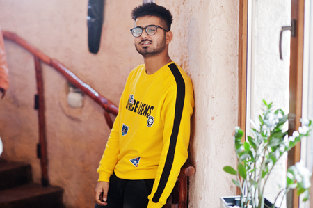 Asian man in eyewear and yellow sweatshirt posing indoor stairs of house against window.