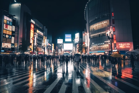 Busy city street with people walking and holding umbrellas. The street is wet and the lights from the buildings reflect on the water. Scene is lively and bustling