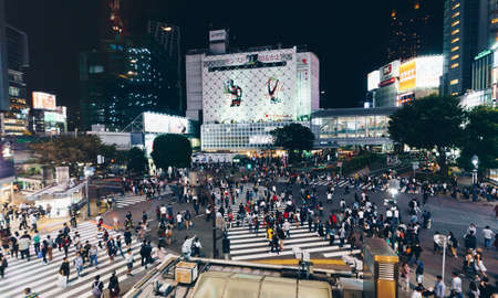 People crossing the street at night in Tokyo, Japan. Shibuya Crossing is one of the busiest crosswalks in the world.