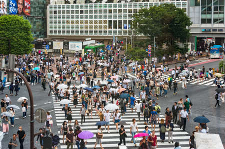 Tokyo, Japan - August 30, 2016: Crowds of tourists and locals on famous Shibuya crossing in Tokyo. Aerial view