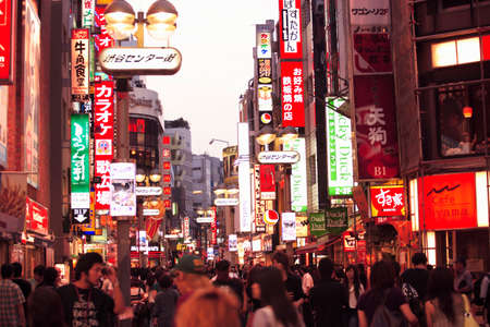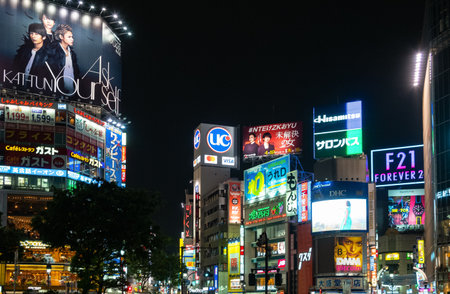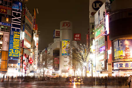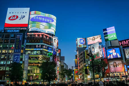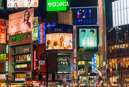 Tokyo, Japan - April 21, 2014: View of Shibuya district at night. Shibuya is known as one of the fashion centers of Japan, particularly for young people, and as a major nightlife area