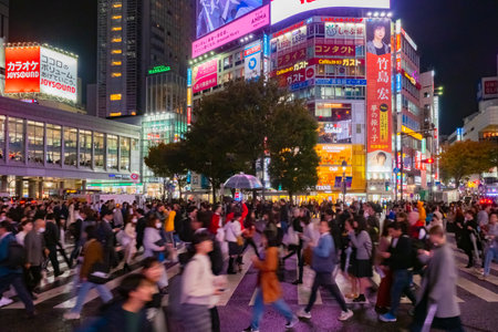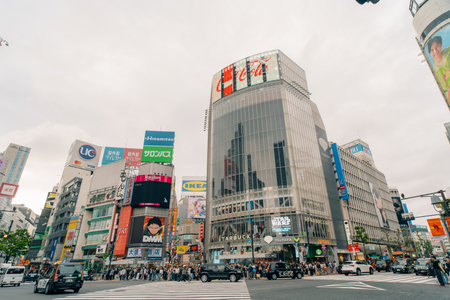 Tokyo, Japan - October 18, 2018: View of Shibuya Crossing, one of the busiest crosswalks in the world. Shibuya, Tokyo, Japan.