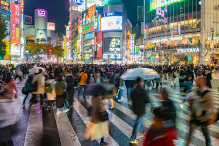 TOKYO, JAPAN - APRIL 8, 2023: People walking in Shibuya shopping area in drizzle evening