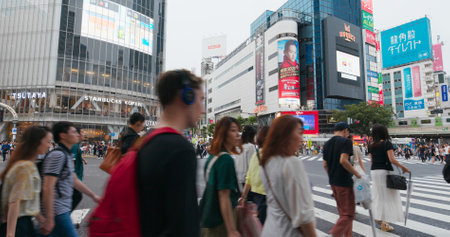 Tokyo, Japan - August 2018: Blurred unidentified pedestrians walking at Shibuya Crossing in Tokyo, Japan