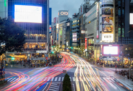 Tokyo, Japan - August 30, 2016: Famous Shibuya crossing in Tokyo with motion blur from cars and vehicles