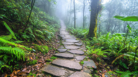 A beautiful stone pathway winds through a dense forest filled with vibrant green foliage and enveloped in a soft mist, offering a tranquil retreat into nature.