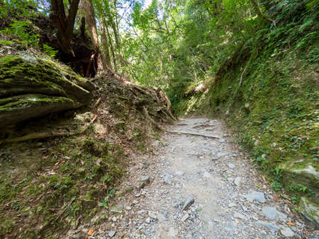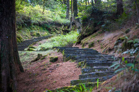 View of natural park with tall preserved tress. Stone steps walkways in the park at Alishan, Taiwan.